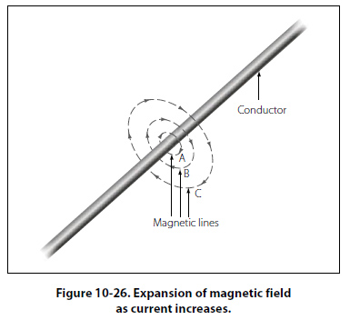 a current carrying wire. A series of concentric circles around the conductor represent the field, which if all the lines were shown would appear more as a continuous cylinder of such circles around the conductor. As long as current flows in the conductor, the lines of force remain around it. [Figure 10-26] If a small current flows through the conductor, there will be a line of force extending out to circle A. If the current flow is increased, the line of force will increase in size to circle B, and a further increase in current will expand it to circle C. As the original line (circle) of force expands from circle A to B, a new line of force will appear at circle A. As the current flow increases, the number of circles of force increases, expanding the outer circles farther from the surface of the current carrying conductor.