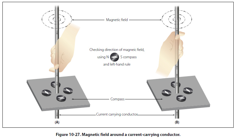 the compass needle is moved around the conductor, it will maintain itself in a position at right angles to the conductor, indicating that the magnetic field around a current carrying conductor is circular. As shown in View B of Figure 10-27, when the direction of current flow through the conductor is reversed, the compass needle will point in the opposite direction, indicating the magnetic field has reversed its direction. A method used to determine the direction of the lines of force when the direction of the current flow is known, is shown in Figure 10-28.