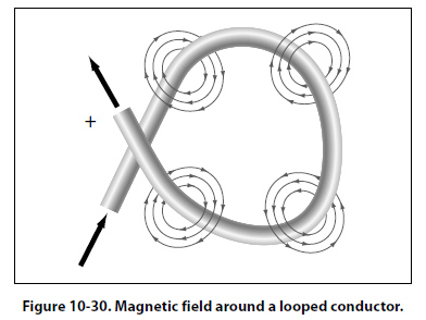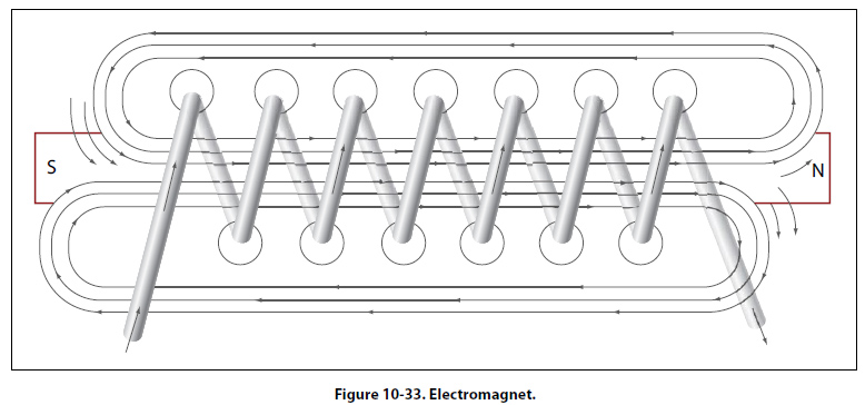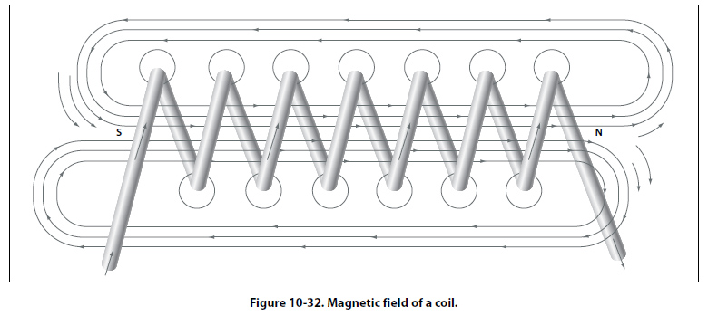 When a wire contains many such loops, it is called a coil. The lines of force form a pattern through all the loops, causing a high concentration of flux lines through the center of the coil. [Figure 10-32]