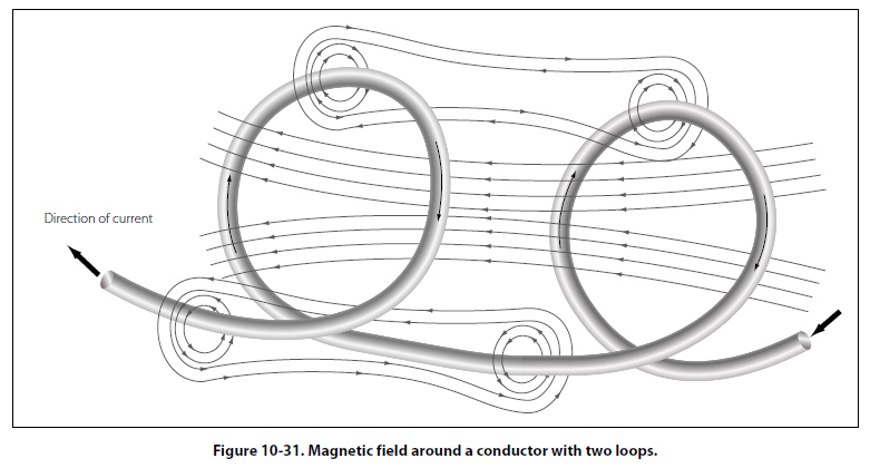 If the wire is coiled into two loops, many of the lines of force become large enough to include both loops. Lines of force go through the loops in the same direction, circle around the outside of the two coils, and come in at the opposite end. [Figure 10-31]