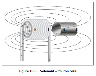 In a coil made from loops of a conductor, many of the lines of force are dissipated between the loops of the coil. By placing a soft iron bar inside the coil, the lines of force will be concentrated in the center of the coil, since soft iron has a greater permeability than air. [Figure 10-33] This combination of an iron core in a coil of