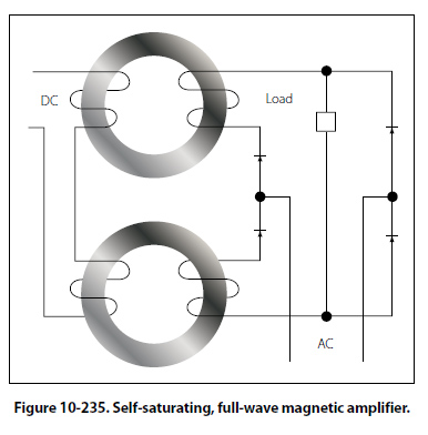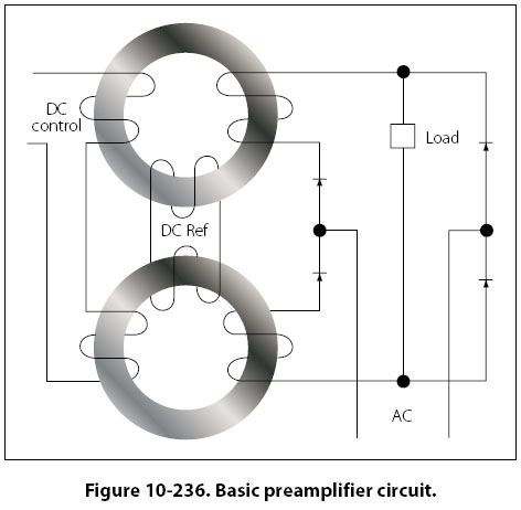 In Figure 10-236 it is assumed that the DC control winding is supplied by a variable source, such as a sensing circuit. To control such a source and use its variations to control the AC output, it is necessary to include another DC winding that has a constant value. This winding, referred to as the reference winding, magnetizes the magnetic core in one direction.