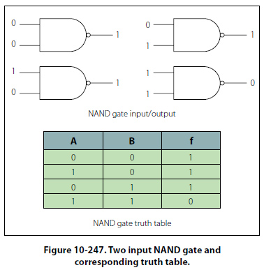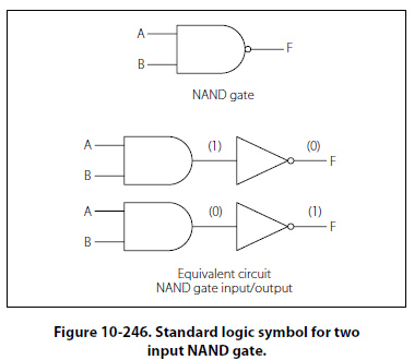 The NAND Gate The term NAND is a combination of the NOT-AND gate and indicates an AND function with an inverted output. A standard logic symbol for a two input NAND gate is shown in Figure 10-246. Notice that an equivalent AND gate with an inverter is also shown.
