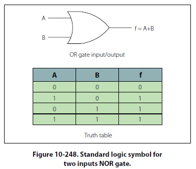 The NOR Gate The term NOR is a combination of the NOT and OR and indicates an OR function with an inverted output. The standard logic symbol for a two-inputs NOR gate is shown in Figure 10-248. Notice that an equivalent AND gate with an inverter is also shown. The logical