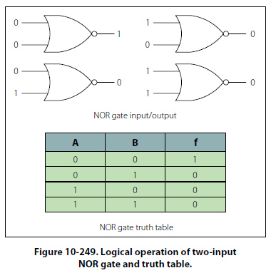 operation of the NOR gate is such that a low output happens when any of its inputs are high. Only when all of its inputs are low is the output high. The logic of this gate produces resultant outputs that are the opposite of the OR gate. In the NOR gate, the low output is the active output level. Figure 10-249 illustrates the logical operation of a two-input NOR gate for all of its possible combinations and the truth table.