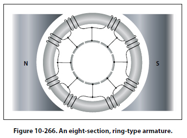 Gramme-Ring Armature There are two general kinds of armatures: the ring and the drum. Figure 10-266 shows a ring-type armature made up of an iron core, an eight-section winding, and an eight-segment commutator. The disadvantage of this arrangement is that the windings, located on the inner side of the iron ring, cut few lines of flux. As a result, they have very little voltage induced in them. For this reason, the Gramme-ring armature is not widely used.