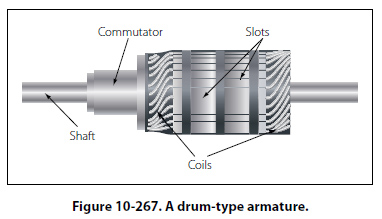 Drum-Type Armature A drum-type armature is shown in Figure 10-267. The armature core is in the shape of a drum and has slots cut into it where the armature windings are placed. The advantage is that each winding completely surrounds the core so that the entire length of the conductor cuts through the magnetic flux. The total induced voltage in this arrangement is far greater than that of the Grammering type armature.
