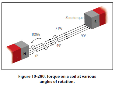 The amount of torque developed in a coil depends upon several factors: the strength of the magnetic field, the number of turns in the coil, and the position of the coil in the field. Magnets are made of special steel that produces a strong field. Since there is torque acting on each turn, the greater the number of turns on the coil, the greater the torque. In a coil carrying a steady current located in a uniform magnetic field, the torque will vary at successive positions of rotation, as shown in Figure 10-280. When the plane of the coil is parallel to the lines of force, the torque is zero. When its plane cuts the lines of force at right angles, the torque is 100 percent. At intermediate positions, the torque ranges between zero and 100 percent.