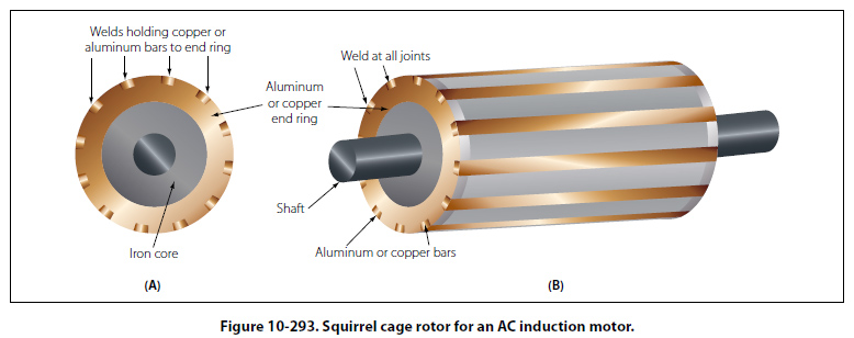Construction of Induction Motor The stationary portion of an induction motor is called a stator, and the rotating member is called a rotor. Instead of salient poles in the stator, as shown in A of Figure 10-292, distributed windings are used; these windings are placed in slots around the periphery of the stator. It is usually impossible to determine the number of poles in an induction motor by visual inspection, but the information can be obtained from the nameplate of the motor. The nameplate usually gives the number of poles and the speed at which the motor is designed to run. This rated, or nonsynchronous, speed is slightly less than the synchronous speed. To determine the number of poles per phase on the motor, divide 120 times the frequency by the rated speed. Written as an equation, it is: P = 120 × f/N Where: P is the number of poles per phase, The result will be very nearly equal to the number of poles per phase. For example, consider a 60 cycle, three phase motor with a rated speed of 1,750 rpm. In this case: P = 120 × 60/1,750 = 7,200/1,750=4.1 Therefore, the motor has four poles per phase. If the number of poles per phase is given on the nameplate, the synchronous speed can be determined by dividing 120 times the frequency by the number of poles per phase. In the example used above, the synchronous speed is equal to 7,200 divided by 4, or 1,800 rpm. The rotor of an induction motor consists of an iron core having longitudinal slots around its circumference in which heavy copper or aluminum bars are embedded. These bars are welded to a heavy ring of high conductivity on either end. The composite structure is sometimes called a squirrel cage, and motors containing such a rotor are called squirrel cage induction motors. [Figure 10-293]