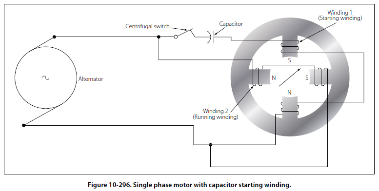 Split Phase Motor There are various types of self-starting motors, known as split phase motors. Such motors have a starting winding displaced 90 electrical degrees from the main or running winding. In some types, the starting winding has a fairly high resistance, which causes the current in this winding to be out of phase with the current in the running winding. This condition produces, in effect, a rotating field and the rotor revolves. A centrifugal switch disconnects the starting winding automatically, after the rotor has attained approximately 25 percent of its rated speed. Capacitor Start Motor With the development of high capacity electrolytic capacitors, a variation of the split phase motor, known as the capacitor start motor, has been made. Nearly all fractional horsepower motors in use today on refrigerators and other similar appliances are of this type. [Figure 10-296] In this adaptation, the starting winding and running winding have the same size and resistance value. The phase shift between currents of the two windings is obtained by using capacitors connected in series with the starting winding.