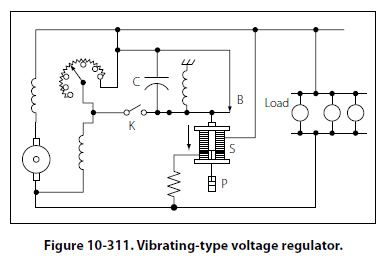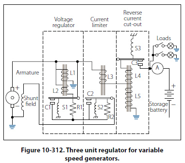 When the terminal voltage rises above a certain critical value, the solenoid downward pull exceeds the spring tension and contact B opens, thus reinserting the field rheostat in the field circuit and reducing the field current and terminal voltage. When the terminal voltage falls below a certain critical voltage, the solenoid armature contact B is closed again by the spring, the field rheostat is now shorted, and the terminal voltage starts to rise. The cycle repeats with a rapid, continuous action. Thus, an average voltage is maintained with or without load change. The dashpot P provides smoother operation by acting as a damper to prevent hunting. The capacitor C across contact B eliminates sparking. Added load causes the field rheostat to be shorted for a longer period of time and, thus, the solenoid armature vibrates more slowly. If the load is reduced and the terminal voltage rises, the armature vibrates more rapidly and the regulator holds the terminal voltage to a steady value for any change in load, from no load to full load, on the generator. Vibrating-type regulators cannot be used with generators, which require a high field current, since the contacts will pit, or burn. Heavy-duty generator systems require a different type of regulator, such as the carbon pile voltage regulator. Three Unit Regulators Many light aircraft employ a three unit regulator for their generator systems. This type of regulator includes a current limiter and a reverse current cutout in addition to a voltage regulator. The action of the voltage regulator unit is similar to the vibrating-type regulator described earlier. The second of the three units is a current regulator to limit the output current of the generator. The third unit is a reverse current cutout that disconnects the battery from the generator. If the battery is not disconnected, it will discharge through the generator armature when the generator voltage falls below that of the battery, thus driving the generator as a motor. This action is called “motoring" the generator and, unless it is prevented, it will discharge the battery in a short time. The operation of a three unit regulator is described in the following paragraphs. [Figure 10-312]