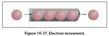 That is, 1 ampere (A) of current is equivalent to 1 coulomb (C) of charge passing through a conductor in 1 second(s). One coulomb of charge equals 6.28 billion billion electrons. The symbol used to indicate current in formulas or on schematics is the capital letter “I." When current flow is one direction, it is called direct current (DC). Later in the text, we will discuss the form of current that periodically oscillates back and forth within the circuit. The present discussion will only be concerned with the use of direct current. The velocity of the charge is actually an average velocity and is called drift velocity. To understand the idea of drift velocity, think of a conductor in which the charge carriers are free electrons. These electrons are always in a state of random motion similar to that of gas molecules. When a voltage is applied across the conductor, an electromotive force creates an electric field within the conductor and a current is established. The electrons do not move in a straight direction but undergo repeated collisions with other nearby atoms. These collisions usually knock other free electrons from their atoms, and these electrons move on toward the positive end of the conductor with an average velocity called the drift velocity, which is relatively a slow speed. To understand the nearly instantaneous speed of the effect of the current, it is helpful to visualize a long tube filled with steel balls as shown in Figure 10-37.
