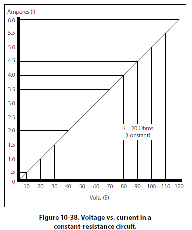 this relationship is true only if the resistance in the circuit remains constant. For it can be seen that if the resistance changes, current also changes. A graph of this relationship is shown in Figure 10-38, which uses a constant resistance of 20O. The relationship between voltage and current in this example shows voltage plotted horizontally along the X axis in values from 0 to 120 volts, and the corresponding values of current are plotted vertically in values from 0 to 6.0 amperes along the Y axis. A straight line drawn through all the points where the voltage and current lines meet represents the equation I = E/20 and is called a linear relationship.