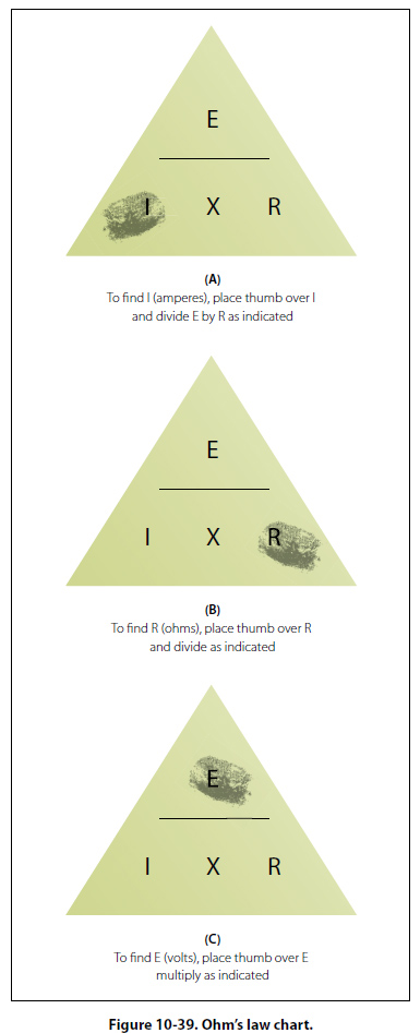 The triangles containing E, R, and I are divided into two parts, with E above the line and I × R below it. To determine an unknown circuit quantity when the other two are known, cover the unknown quantity with a thumb. The location of the remaining uncovered letters in the triangle will indicate the mathematical operation to be performed. For example, to find I, refer to Figure 10-39A, and cover I with the thumb. The uncovered letters indicate that E is to be divided by R, or I = E/R. To find R, refer to Figure 10-39B, and cover R with the thumb. The result indicates that E is to be divided by I, or R = E/I. To find E, refer to Figure 10-39C, and cover E with the thumb. The result indicates I is to be multiplied by R, or E = I × R. This chart is useful when learning to use Ohm’s law. It should be used to supplement the beginner’s knowledge of the algebraic method. |