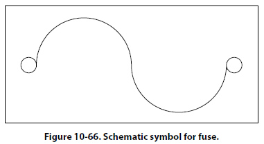 Circuit Protection Devices Perhaps the most serious trouble in a circuit is a direct short. The term, “direct short," describes a situation in which some point in the circuit, where full system voltage is present, comes in direct contact with the ground or return side of the circuit. This establishes a path for current flow that contains no resistance other than that present in the wires carrying the current, and these wires have very little resistance. Most wires used in aircraft electrical circuits are small gauge, and their current carrying capacity is quite limited. The size of the wires used in any given circuit is determined by the amount of current the wires are expected to carry under normal operating conditions. Any current flow in excess of normal, such as the case of a direct short, would cause a rapid generation of heat. If the excessive current flow caused by the short is left unchecked, the heat in the wire will continue causing perhaps a portion of the wire to melt and at the very least, open the circuit. To protect aircraft electrical systems from damage and failure caused by excessive current, several kinds of protective devices are installed in the systems. Fuses, circuit breakers, thermal protectors, and arc fault circuit breakers are used for this purpose. Circuit protective devices, as the name implies, all have a common purpose — to protect the units and the wires in the circuit. Some are designed primarily to protect the wiring and to open the circuit in such a way as to stop the current flow when the current becomes greater than the wires can safely carry. Other devices are designed to protect a unit in the circuit by stopping the current flow to it when the unit becomes excessively warm. Fuse Figure 10-66 shows the schematic symbol for the fuse. Fuses are used to protect the circuit from over current conditions. The fuse is installed in the circuit so that