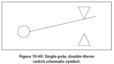 Single-Pole, Double-Throw (SPDT) The single-pole, double-throw switch is shown in Figure 10-69. With this switch, contact between one contact can be made between one contact and the other.