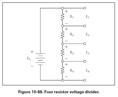 The voltage drop across any particular resistor shall be called EX, where the subscript x is the value of a particular resistor (1, 2, 3, or 4). Using Ohm’s law, the voltage drop across any resistor can be determined. Ohm’s law: EX = I (RX) As seen earlier in the text, the current is equal to the source voltage divided by the total resistance of the series circuit. Current: I = ES/RT The current equation can now be substituted into the equation for Ohm’s law. Substitute: Ex =(Es/Rt)(Rx) This equation is the general voltage divider formula. The explanation of this formula is that the voltage drop across any resistor or combination of resistors in a series circuit is equal to the ratio of the resistance value to the total resistance, divided by the value of the source voltage. Figure 10-89 illustrates this with a network of three resistors and one voltage source.