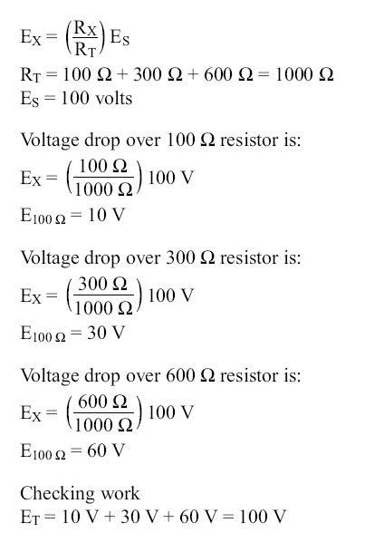 Determining the Voltage Divider Formula Figure 10-88 shows the example network of four resistors and a voltage source. With a few simple calculations, a formula for determining the voltage divisions in a series circuit can be determined.