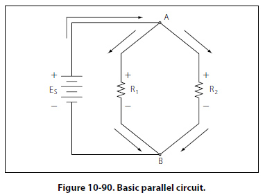 Figure 10-90 depicts the most basic parallel circuit. Current flowing out of the source divides at point A in the diagram and goes through R1 and R2. As more branches are added to the circuit, more paths for the source current are provided.
