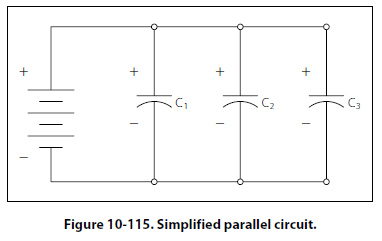 Capacitors in Parallel When capacitors are connected in parallel, the effective plate area increases, and the total capacitance is the sum of the individual capacitances. Figure 10-115 shows a simplified parallel circuit.