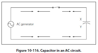 QT = Q1 + Q2 + Q3 Because Q = CE: CTET = C1E1 + C2E2 + C3E3 Voltages can be factored out because: ET = E1 + E2 + E3 Leaving us with the equation for capacitors in parallel: CT = C1 + C2 + C3 Consider the following example: If C1 = 330µF, C2 = 220µF Capacitors in Alternating Current If a source of alternating current is substituted for the battery, the capacitor acts quite differently than it does with direct current. When an alternating current is applied in the circuit, the charge on the plates constantly changes. [Figure 10-116] This means that electricity must flow first from Y clockwise around to X, then from X counterclockwise around to Y, then from Y clockwise around to X, and so on. Although no current flows through the insulator between the plates of the capacitor, it constantly flows in the remainder of the circuit between X and Y. In a circuit in which there is only capacitance, current leads the applied voltage as contrasted with a circuit in which there is inductance, where the current lags the voltage.