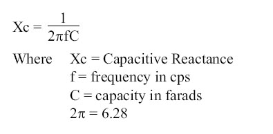Capacitive Reactance Xc The effectiveness of a capacitor in allowing an AC flow to pass depends upon the capacitance of the circuit and the applied frequency. To what degree a capacitor allows an AC flow to pass depends largely upon the capacitive value of the capacitor given in farads (f ). The greater the capacitance of the capacitor, the greater the number of electrons, measured in Coulombs, necessary to bring the capacitor to a fully charged state. Once the capacitor approaches or actually reaches a fully charged condition, the polarity of the capacitor will oppose the polarity of the applied voltage, essentially acting then as an open circuit. To further illustrate this characteristic and how it manifests itself in an AC circuit, consider the following. If a capacitor has a large capacitive value, meaning that it requires a relatively large number of electrons to bring it to a fully charged state, then a rather high frequency current can alternate through the capacitor without the capacitor ever reaching a full charge. In this case, if the frequency is high enough and the capacitance large enough that there is never enough time for the capacitor to ever reach a full charge, it is possible that the capacitor may offer very little or no resistance to the current. However, the smaller the capacitance, the fewer electrons are required to bring it up to a full charge and it is more likely that the capacitor will build up enough of an opposing charge that it can present a great deal of resistance to the current if not to the point of behaving like an open circuit. In between these two extreme conditions lies a continuum of possibilities of current opposition depending on the combination of alpplied frequency and the selected capacitance. Current in an AC circuit can be controlled by changing the circuit capacitance in a similar manner that resistance can control the current. The actual AC reactance Xc, which just like resistance, is measured in ohms (O). Capacitive reactance Xc is determined by the following: