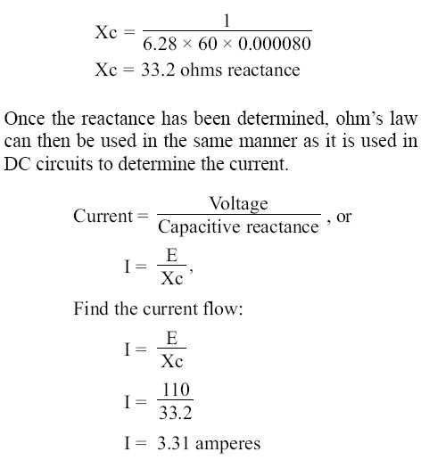 Sample Problem: A series circuit is assumed in which the impressed voltage is 110 volts at 60 cps, and the capacitance of a condenser is 80 Mf. Find the capacitive reactance and the current flow. Solution: To find capacitive reactance, the equation Xc = 1/(2 pf C) is used. First, the capacitance, 80 Mf, is changed to farads by dividing 80 by 1,000,000, since 1 million microfarads is equal to 1 farad. This quotient equals 0.000080 farad. This is substituted in the equation and