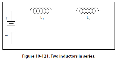 Inductors in Series If we connect two inductors in series as shown in Figure 10-121, the same current flows through both inductors and, therefore, both will be subject to the same rate of change of current. When inductors are connected in series, the total inductance LT, is the sum of the individual inductors. The general equation for n number of inductors in series is: