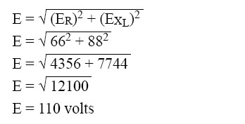 The sum of the two voltages is greater than the impressed voltage. This results from the fact that the two voltages are out of phase and, as such, represent the maximum voltage. If the voltage in the circuit is measured by a voltmeter, it will be approximately 110 volts, the impressed voltage. This can be proved by the equation,