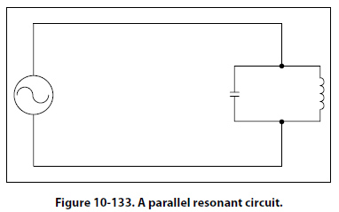 Since at the resonant frequency XL cancels XC, the current can become very large, depending on the amount of resistance. In such cases, the voltage drop across the inductor or capacitor will often be higher than the applied voltage. In a parallel resonant circuit, the reactances are equal and equal currents will flow through the coil and the capacitor. [Figure 10-133]