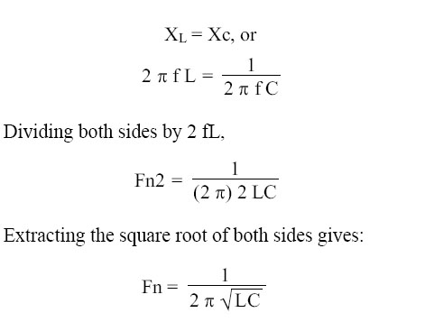 Where Fn is the resonant frequency in cycles per second, C is the capacitance in farads, and L is the inductance in henries. With this formula, the frequency at which a capacitor and inductor will be resonant can be determined. To find the inductive reactance of a circuit use: XL = 2 (∏) f l
