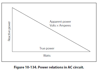 Power in AC Circuits In a DC circuit, power is obtained by the equation, P = EI, (watts equal volts times amperes). Thus, if 1 ampere of current flows in a circuit at a pressure of 200 volts, the power is 200 watts. The product of the volts and the amperes is the true power in the circuit. True Power Defined The power dissipated in the resistance of a circuit, or the power actually used in the circuit. In an AC circuit, a voltmeter indicates the effective voltage and an ammeter indicates the effective current. The product of these two readings is called the apparent power. Apparent Power Defined That power apparently available for use in an AC circuit containing a reactive component. It is the product of effective voltage times the effective current, expressed in volt-amperes. It must be multiplied by the power factor to obtain true power available. Only when the AC circuit is made up of pure resistance is the apparent power equal to the true power. [Figure 10-134] When there is capacitance or inductance in the circuit, the current and voltage are not exactly in phase, and the true power is less than the apparent power. The true power is obtained by a wattmeter reading. The ratio of the true power to the apparent power is called the power factor and is usually expressed in percent. In equation form, the relationship is: