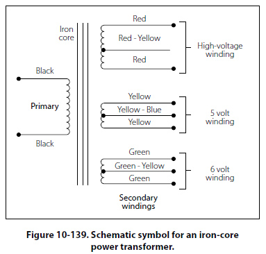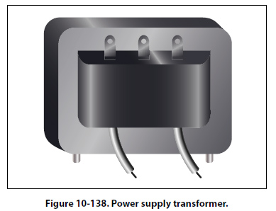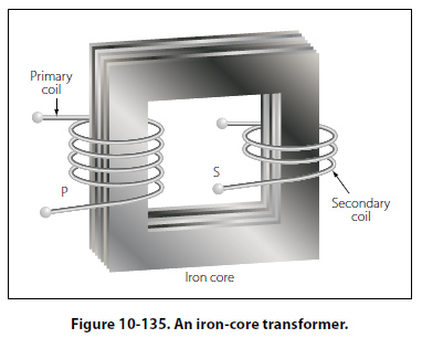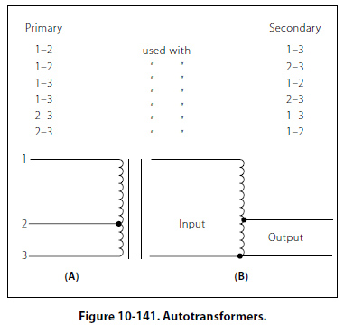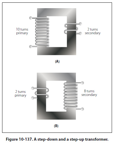 There are many types of voltage transformers. Most of these are either step-up or step-down transformers. The factor that determines whether a transformer is a step-up, or step-down type is the “turns" ratio. The turns ratio is the ratio of the number of turns in the primary winding to the number of turns in the secondary winding. For example, the turns ratio of the step-down transformer shown in Figure 10-137A is 5 to 1, since there are five times as many turns in the primary as in the secondary. The step-up transformer shown in Figure 10-137B has a 1 to 4 turns ratio.