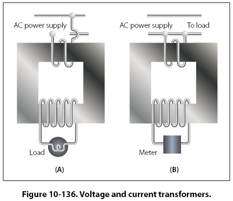 The primary and secondary of this closed core transformer are wound on a closed core to obtain maximum inductive effect between the two coils. There are two classes of transformers: (1) voltage transformers used for stepping up or stepping down voltages, and (2) current transformers used in instrument circuits. In voltage transformers, the primary coils are connected in parallel across the supply voltage as shown in Figure 10-136A. The primary windings of current transformers are connected in series in the primary circuit [Figure 10-136B]. Of the two types, the voltage transformer is the more common.