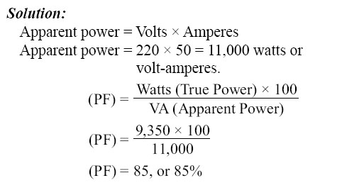 Power Factor (PF) =100 × Watts (True Power)/Volts × Amperes (Apparent Power) Example: A 220-volt AC motor takes 50 amperes from the line, but a wattmeter in the line shows that only 9,350 watts are taken by the motor. What are the apparent power and the power factor?