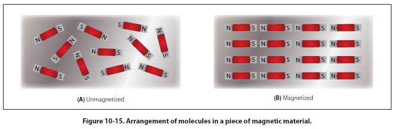 The theory that explains the action of a magnet holds that each molecule making up the iron bar is itself a tiny magnet, with both north and south poles as illustrated in Figure 10-15A. These molecular magnets each possess a magnetic field, but in an unmagnetized state,