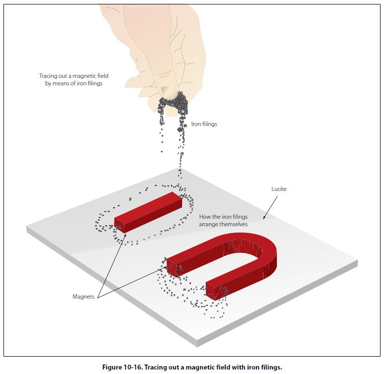 the molecules are arranged at random throughout the iron bar. If a magnetizing force, such as stroking with a lodestone, is applied to the unmagnetized bar, the molecular magnets rearrange themselves in line with the magnetic field of the lodestone, with all north ends of the magnets pointing in one direction and all south ends in the opposite direction. This is illustrated in Figure 10-15B. In such a configuration, the magnetic fields of the magnets combine to produce the total field of the magnetized bar. When handling a magnet, avoid applying direct heat, or hammering or dropping it. Heating or sudden shock will cause misalignment of the molecules, causing the strength of a magnet to decrease. When a magnet is to be stored, devices known as “keeper bars" are installed to provide an easy path for flux lines from one pole to the other. This promotes the retention of the molecules in their north-south alignment. The presence of the magnetic force or field around a magnet can best be demonstrated by the experiment illustrated in Figure 10-16. A sheet of transparent material, such as glass or Lucite™, is placed over a
