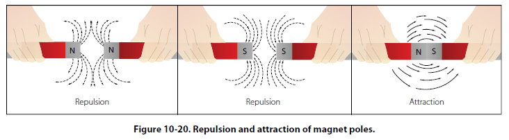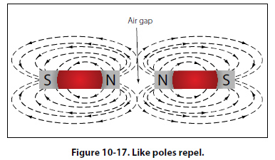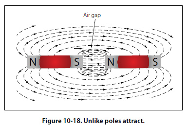 path parallel to each other. Lines moving in this manner repel each other, causing the magnets as a whole to repel each other. By reversing the position of one of the magnets, the attraction of unlike poles can be demonstrated, as shown in Figure 10-18.