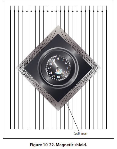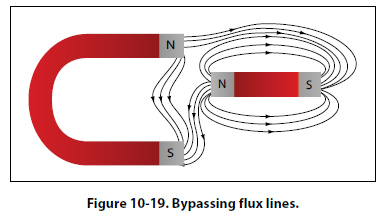 each piece immediately becomes a magnet itself, with a north and south pole. This feature supports the theory that each molecule is a magnet, since each successive division of the magnet produces still more magnets. Since the magnetic lines of force form a continuous loop, they form a magnetic circuit. It is impossible to say where in the magnet they originate or start. Arbitrarily, it is assumed that all lines of force leave the north pole of any magnet and enter at the south pole. There is no known insulator for magnetic flux, or lines of force, since they will pass through all materials. However, they will pass through some materials more easily than others. Thus it is possible to shield items such as instruments from the effects of the flux by surrounding them with a material that offers an easier path for the lines of force. Figure 10-22 shows an instrument surrounded by a path of soft iron, which offers very little opposition to magnetic flux. The lines of force take the easier path, the path of greater permeability, and are guided away from the instrument.