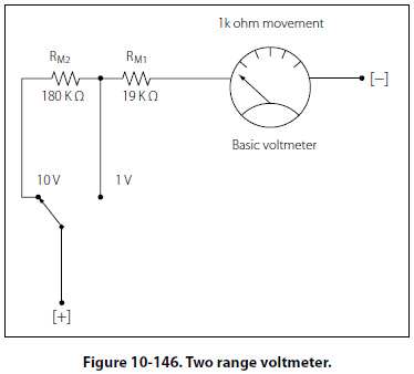 For a 50ľA movement, the total resistance required is 20 k O for each volt of full scale reading. In other words, the sensitivity for a 50ľA movement is always 20 k O regardless of the selected range. The full-scale meter current is 50ľA at any range selection. To find the total meter resistance, multiply the sensitivity by the full scale voltage for that particular range. For example for a 10 volt range, RT = (20k O/V)/(10 V) = 200k O. The total resistance for the 1 volt range is 20k O, so RM for a 10 V range will be 200k O - 20k O = 180k O. This two-range voltmeter is illustrated in Figure 10-146.