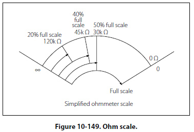Ohmmeter Scale Figure 10-149 shows a typical analog ohmmeter scale. Between zero and infinity (8), the scale is marked to indicate various resistor values. Because the values decrease from left to right, this scale is often called a back-off scale.