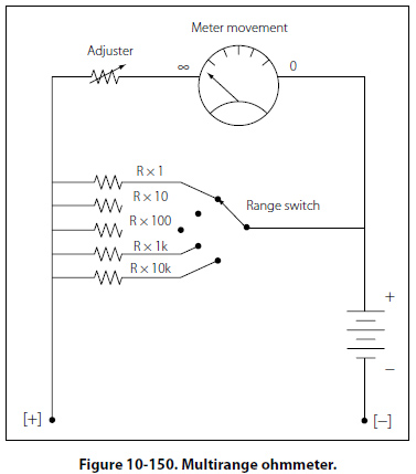 In the case of the example given, assume that a certain ohmmeter uses a 50ľA, 1000O meter movement and has an internal 1.5 volt battery. A current of 50ľA produces a full-scale deflection when the test leads are shorted. To have 50ľA, the total ohmmeter resistance is 1.5 V/50ľA = 30kO. Therefore, since the coil resistance is 1kO, the variable zero adjustment resistor must be set to 30kO 1kO = 29kO. Now consider that a 120kO resistor is connected to the ohmmeter leads. Combined with the 30kO internal resistance, the total R is 150kO. The current is 1.5 V/150kO = 10ľA, which is 20% of the full scale current and which appears on the scale as shown in Figure 10-149. Now consider further that a 120kO resistor is connected to the ohmmeter leads. This will result in a current of 1.5V/75kO = 10ľA, which is 40% of the full scale current and which is marked on the scale as shown. Additional calculations of this type show that the scale is nonlinear. It is more compressed toward the left side than the right side. The center scale point corresponds to the internal meter resistance of 30kO. The reason is as follows: With 30kO connected to the leads, the current is 1.5V/60kO = 25ľA, which is half of the full scale current of 50ľA. The Multirange Ohmmeter A practical ohmmeter usually has several operational ranges. These typically are indicated by R × 1, R × 10, R × 100, R × 1k, R × 100k and R × 1M. These range selections are interpreted in a different manner than that of an ammeter or voltmeter. The reading on the ohmmeter scale is multiplied by the factor indicated by the range setting. For example, if the pointer is set on the scale and the range switch is set at R × 100, the actual resistance measurement is 20 × 100 or 2kO. To measure small resistance values, the technician must use a higher ohmmeter current than is needed for measuring large resistance values. Shunt resistors are needed to provide multiple ranges on the ohmmeter to measure a range of resistance values from the very small to very large. For each range, a different value of shunt resistance is switched in. The shunt resistance increases for higher ohm ranges and is always equal to the center scale reading on any selected range. In some meters, a higher battery voltage is used for the highest ohm range. A common circuit arrangement is shown in Figure 10-150.