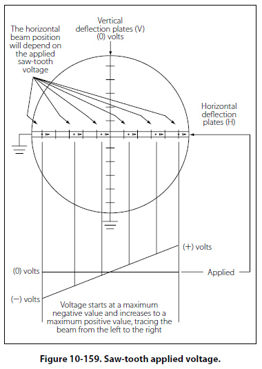 By providing a neutral or zero voltage to a deflection plate, the electron beam will be unaffected. By applying a negative voltage to a plate, the electron beam with be repelled and driven away from the plate. Finally, by applying a positive voltage, the electron beam will be drawing to the plate. Figure 10-158 provides a few possible plate voltage combinations and the resultant beam position. Horizontal Deflection To get a visual representation of the input signal, an internally generated saw-tooth voltage is generated and then applied to the horizontal deflection plates. Figure 10-159 illustrates that the saw-tooth is a pattern of voltage applied, which begins at a negative voltage and increases at a constant rate to a positive voltage.