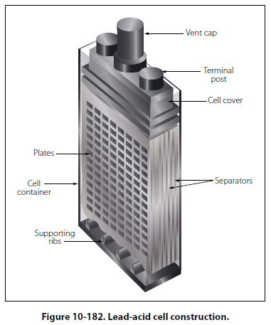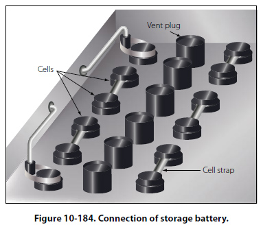 The individual cells of the battery are connected in series by means of cell straps. [Figure 10-184] The complete assembly is enclosed in an acid resisting metal container (battery box), which serves as electrical shielding and mechanical protection.
