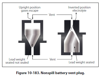 A practical cell is constructed with many more plates than just two in order to get the required current output. All positive plates are connected together as well as all the negatives. Because each positive plate is always positioned between two negative plates, there are always one or more negative plates than positive plates. Between the plates are porous separators that keep the positive and negative plates from touching each other and shorting out the cell. The separators have vertical ribs on the side facing the positive plate. This construction permits the electrolyte to circulate freely around the plates. In addition, it provides a path for sediment to settle to the bottom of the cell. Each cell is seated in a hard rubber casing through the top of which are terminal posts and a hole into which is screwed a nonspill vent cap. The hole provides access for testing the strength of the electrolyte and adding water. The vent plug permits gases to escape from the cell with a minimum of leakage of electrolyte, regardless of the position the airplane might assume. Figure 10-183 shows the construction of the vent plug. In level flight, the lead weight permits venting of gases through a small hole. In inverted flight, this hole is covered by the lead weight.