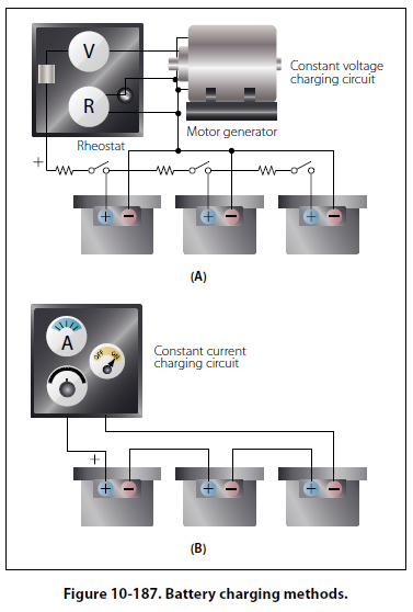 a constant, regulated voltage forces the current through the battery. In this method, the current at the start of the process is high but automatically tapers off, reaching a value of approximately 1 ampere when the battery is fully charged. The constant voltage method requires less time and supervision than does the constant current method. In the constant current method (Figure 10-187B), the current remains almost constant during the entire charging process. This method requires a longer time to charge a battery fully and, toward the end of the process, presents the danger of overcharging, if care is not exercised. In the aircraft, the storage battery is charged by direct current from the aircraft generator system. This method of charging is the constant voltage method, since the generator voltage is held constant by use of a voltage regulator. When a storage battery is being charged, it generates a certain amount of hydrogen and oxygen. Since this is an explosive mixture, it is important to take steps to prevent ignition of the gas mixture. Loosen the vent caps and leave in place. Do not permit open flames, sparks, or other sources of ignition in the vicinity. Before disconnecting or connecting a battery to the charge, always turn off the power by means of a remote switch. |
