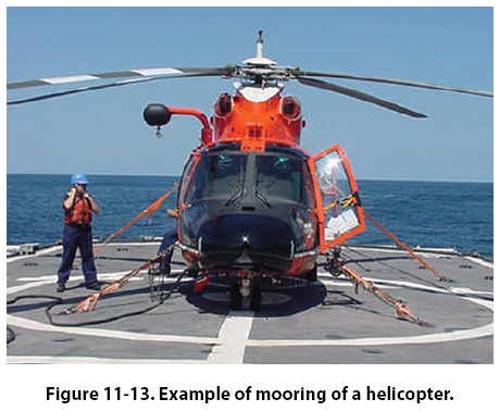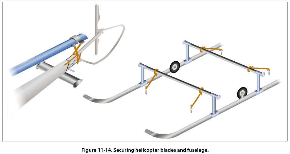 Chapter 11. Safety, Ground Operations, & Servicing Tiedown Procedures for Seaplanes Seaplanes can be moored to a buoy, weather permitting, or tied to a dock. Weather causes wave action, and waves cause the seaplane to bob and roll. This bobbing and rolling while tied to a dock can cause damage. When warning of an impending storm is received and it is not possible to fly the aircraft out of the storm area, some compartments of the seaplane can be flooded, partially sinking the aircraft. In addition, the aircraft should be tied down securely to anchors. Seaplanes tied down on land have been saved from high-wind damage by filling the floats with water in addition to tying the aircraft down in the usual manner. During heavy weather, if possible, remove the seaplane from the water and tie down in the same manner as a land plane. If this is not possible, the seaplane could be anchored in a sheltered area away from wind and waves. Tiedown Procedures for Ski Planes Ski planes are tied down, if the securing means are available, in the same manner as land planes. Ski-equipped airplanes can be secured on ice or in snow by using a device called a dead-man. A dead-man is any item at hand (such as a piece of pipe, log, and so forth) that a rope is attached to and buried in a snow or ice trench. Using caution to keep the free end of the rope dry and unfrozen, snow is packed in the trench. If available, pour water into the trench; when it is frozen, tie down the aircraft with the free end of the rope. Operators of ski-equipped aircraft sometimes pack soft snow around the skis, pour water on the snow, and permit the skis to freeze to the ice. This, in addition to the usual tiedown procedures, aids in preventing damage from windstorms. Caution must be used when moving an aircraft that has been secured in this manner to ensure that a ski is not still frozen to the ground. Otherwise, damage to the aircraft or skis can occur. Tiedown Procedures for Helicopters Helicopters, like other aircraft are secured to prevent structural damage, which can occur from high-velocity surface winds. Helicopters should be secured in hangars, when possible. If not, they should be tied down securely. Helicopters that are tied down can usually sustain winds up to approximately 65 mph. If at all possible, helicopters should be evacuated to a safe area if tornadoes or hurricanes are anticipated. For added protection, helicopters should be moved to a clear area so that they will not be damaged by flying objects or falling limbs from surrounding trees. If high winds are anticipated with the helicopter parked in the open, the main rotor blades should be tied down. Detailed instructions for securing and mooring each type of helicopter can be found in the applicable maintenance manual. [Figure 11-13] Methods of securing helicopters vary with weather conditions, the length of time the aircraft is expected to remain on the ground, and location and characteristics of the aircraft. Wheel chocks, control locks, rope tiedowns, mooring covers, tip socks, tiedown assemblies, parking brakes, and rotor brakes are used to secure helicopters.