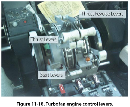 Check the aircraft fuel sumps for water or ice, and inspect the engine air inlet for general condition and the presence of foreign objects. Visually inspect the fan blades, forward compressor blades, and the compressor inlet guide vanes for nicks and other damage. If possible, check the fan blades for free rotation by turning the fan blades by hand. All engine controls should be operated, and engine instruments and warning lights should be checked for proper operation. Starting a Turbofan Engine The following procedures are typical of those used to start many turbine engines. There are, however, wide variations in the starting procedures used for turbine engines, and no attempt should be made to use these procedures in the actual starting of an engine. These procedures are presented only as a general guide for familiarization with typical procedures and methods. In the starting of all turbine engines, refer to the detailed procedures contained in the applicable manufacturer’s instructions or their approved equivalent. Most turbofan engines can be started by either air turbine or electrical starters. Air-turbine starters use compressed air from an external source as discussed earlier. Fuel is turned on either by moving the start lever to “idle/start" position or by opening a fuel shutoff valve. If an air turbine starter is used, the engine should “light off" within a predetermined time after the fuel is turned on. This time interval, if exceeded, indicates a malfunction has occurred and the start should be discontinued. Most turbofan engine controls consist of a power lever, reversing levers, and start levers. Newer aircraft have replaced the start levers with a fuel switch. [Figure 11-18] Turbofan engines also use all the normal instruments speeds, (percent of total rpm) exhaust gas temperature, fuel flow, oil pressure, and temperature. An instrument that measures the amount of thrust being delivered is the engine pressure ratio. This measures the ratio between the inlet pressure to the outlet pressure of the turbine.