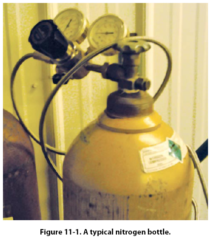 Chapter 11. Safety, Ground Operations, & Servicing Fire Safety Anytime current flows, whether during generation or transmission, a byproduct of that flow is heat. The greater the current flow, the greater the amount of heat created. When this heat becomes too great, protective coatings on wiring and other electrical devices can melt, causing shorting, which leads to more current flow and greater heat. This heat can become so great that metals can melt, liquids vaporize, and flammable substances ignite. An important factor in preventing electrical fires is to keep the area around electrical work or electrical equipment clean, uncluttered, and free of all unnecessary flammable substances. Ensure that all power cords, wires, and lines are free of kinks and bends which can damage the wire. Never place wires or cords where they will be walked on or run over by other equipment. When several wires inside a power cord are broken, the current passing through the remaining wires increases. This generates more heat than the insulation coatings on the wire are designed to withstand and can lead to a fire. Closely monitor the condition of electrical equipment. Repair or replace damaged equipment before further use. Safety Around Compressed Gases Compressed air, like electricity, is an excellent tool as long as it is under control. A typical nitrogen bottle set is shown in Figure 11-1.