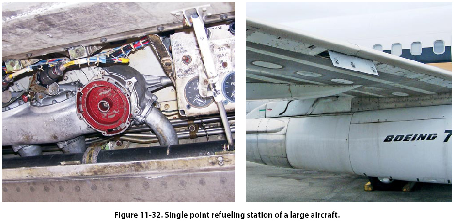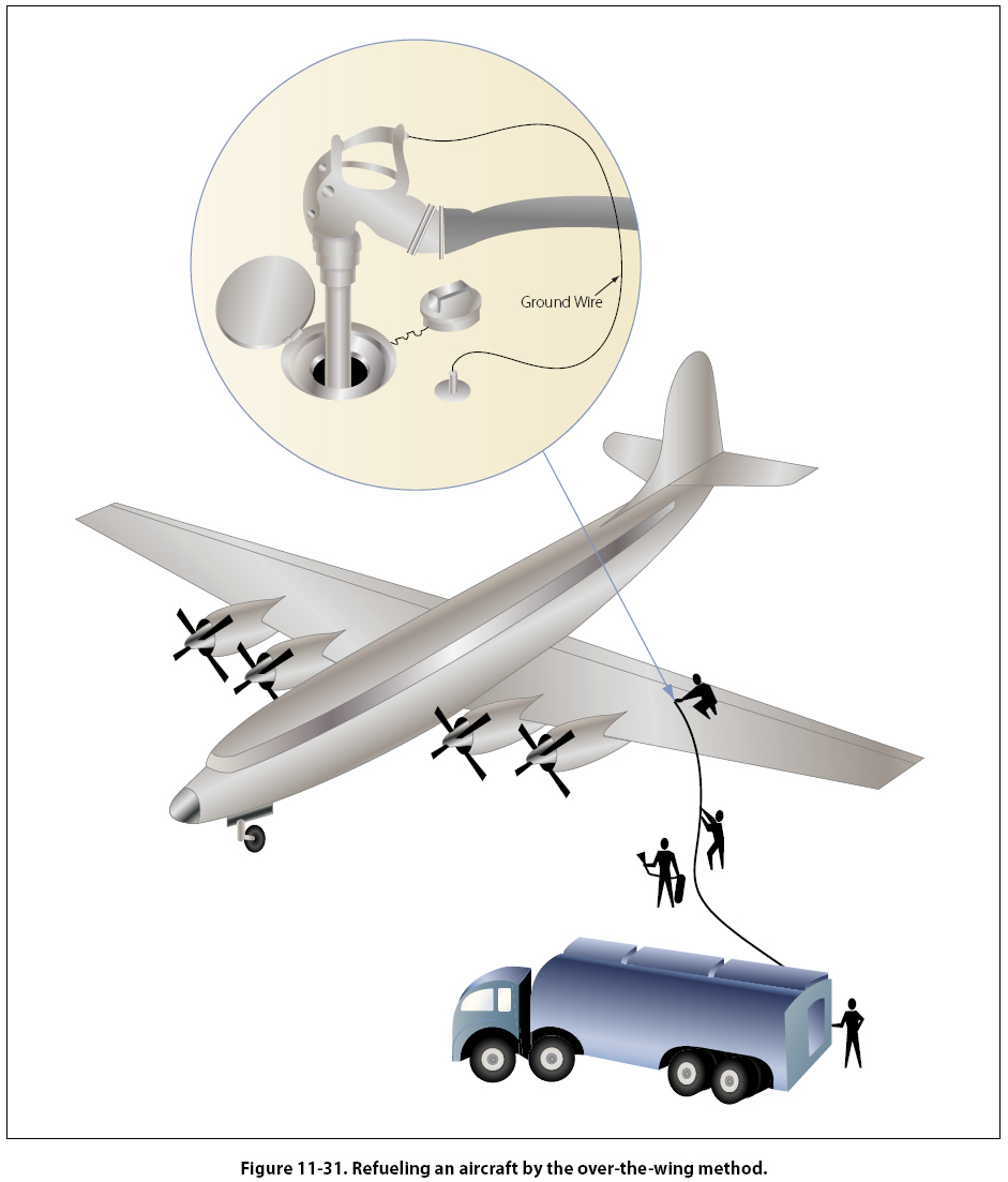 Chapter 11. Safety, Ground Operations, & Servicing Fueling Hazards The volatility of aviation fuels creates a fire hazard that has plagued aviators and aviation engine designers since the beginning of powered flight. Volatility is the ability of a liquid to change into a gas at a relatively low temperature. In its liquid state, aviation fuel will not burn. It is, therefore, the vapors, or gaseous state to which the liquid fuel changes that is not only useful in powering the aircraft, but also a fire hazard. Static electricity is a byproduct of one substance rubbing against another. Fuel flowing through a fuel line causes a certain amount of static electricity. The greatest static electricity concern around aircraft is that during flight, the aircraft moving through the air causes static electricity to build in the airframe. If that static electricity is not dissipated prior to refueling, the static electricity in the airframe will try to return to ground through the fuel line from the servicing unit. The spark caused by the static electricity can ignite any vaporized fuel. Breathing the vapors from fuel can be harmful and should be limited. Any fuel spilled on the clothing or skin must be removed as soon as possible. Fueling Procedures The proper fueling of an aircraft is the responsibility of the owner/operator. This does not, however, relieve the person doing the fueling of the responsibility to use the correct type of fuel and safe fueling procedures. There are two basic procedures when fueling an aircraft. Smaller aircraft are fueled by the over-the-wing method. This method uses the fuel hose to fill through fueling ports on the top of the wing. The method used for larger aircraft is the single point fueling system. This type of fueling system uses receptacles in the bottom leading edge of the wing, which is used to fill all the tanks from this one point. This decreases the time it takes to refuel the aircraft, limits contamination, and reduces the chance of static electricity igniting the fuel. Most pressure fueling systems consist of a pressure fueling hose and a panel of controls and gauges that permit one person to fuel or defuel any or all fuel tanks of an aircraft. Each tank can be filled to a predetermined level. These procedures are illustrated in Figures 11-31 and 11-32.